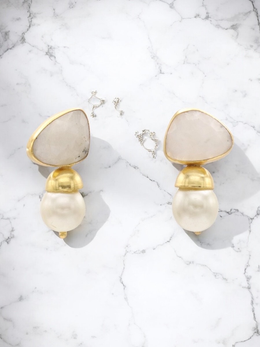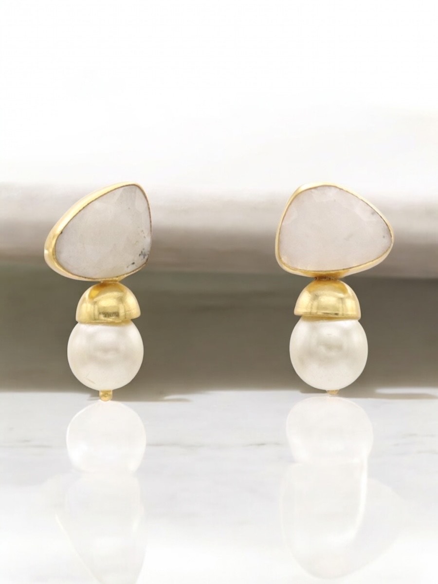 Unieke gouden oorbellen bestaande uit een facet-geslepen maansteen en grote zoetwaterparel. Een ideaal model voor je garderobe omdat het een basic is die je outfit tot een nieuw niveau kan tillen. Deze oorbellen zijn handgemaakt door de beste materialen te selecteren, om unieke, exclusieve en elegante stukken te verkrijgen.