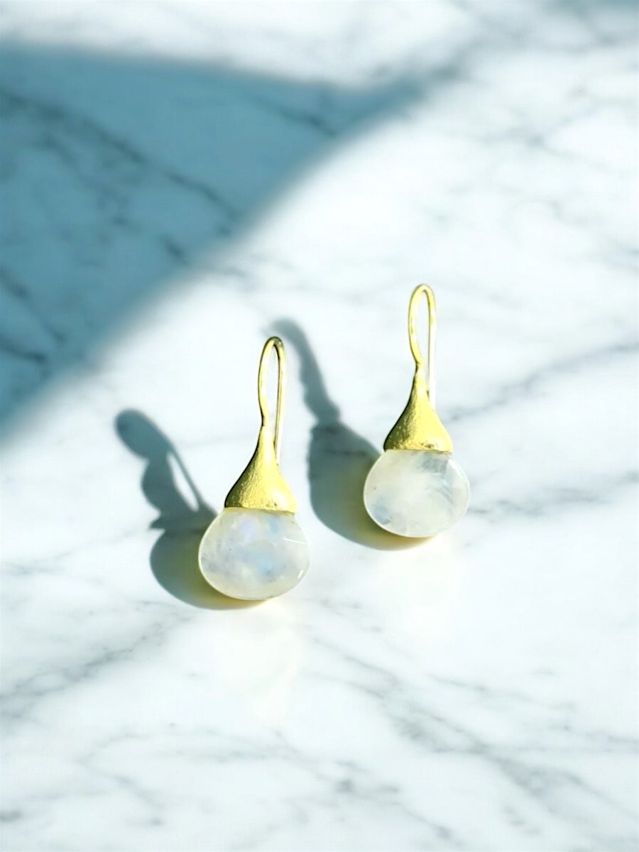 Unieke druppelvormige gouden oorbellen met gefacetteerde regenboog maansteen. Een prachtig minimalistisch en elegant ontwerp. Deze unieke oorbellen zijn handgemaakt van hoogwaardige materialen.